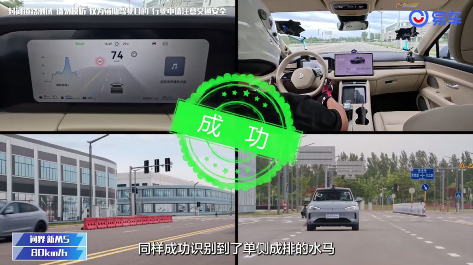 在斜向锥桶测试场景中,当以100km/h和60km/h的速度分别驶向90cm和60cm的桩筒时,问界新M5均能迅速识别并自动刹停,展现出了卓越的主动安全性能。相比之下,Model Y和L6在60km/h的速度下虽然能识别到这些桩筒,但并未采取任何警示或制动措施。这一对比清晰地表明,问界新M5在主动安全能力上明显领先。