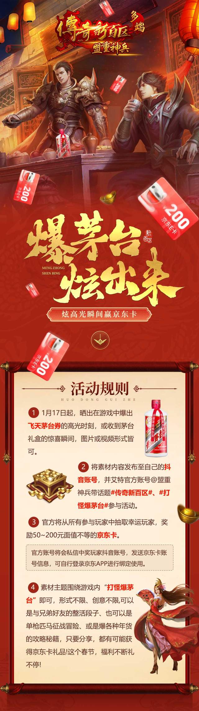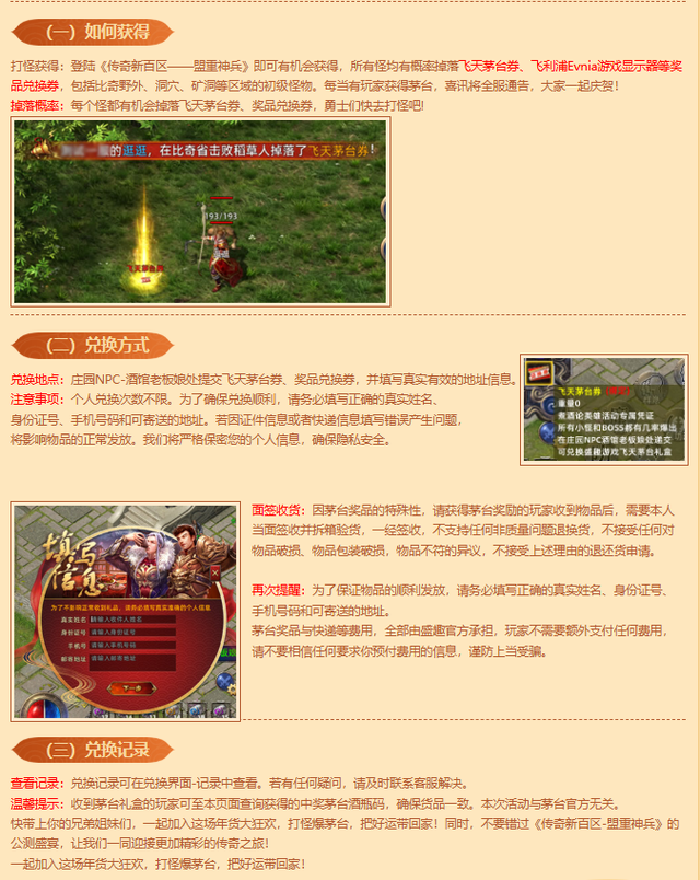 值得一提的是,为了庆祝公测,《传奇新百区-盟重神兵》手游推出了一系列福利活动,其中最引人注目的当属“打怪爆茅台”活动。全图所有怪物都有可能随机掉落“飞天茅台券”,玩家只需凭此券在NPC处填写地址,官方便会寄送价值超过2500元的原装正品53度飞天茅台礼盒。