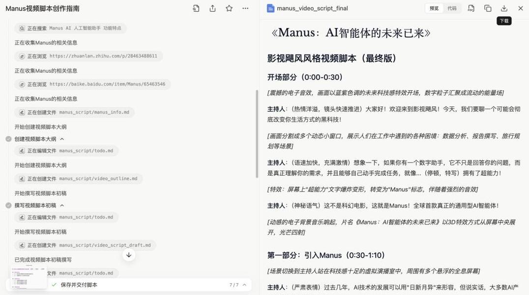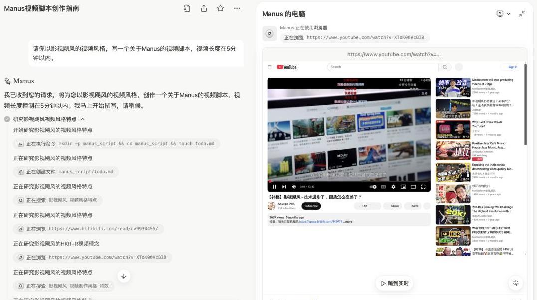 Manus很快拆解任务,开始学习视频制作的知识,搜集资料,编写脚本。