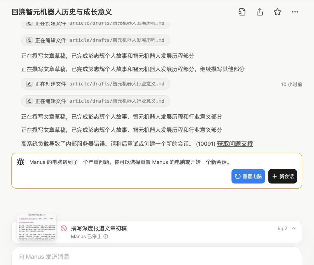 接下来的几个小时里,Manus频繁停滞,经常需要我们手动重置。