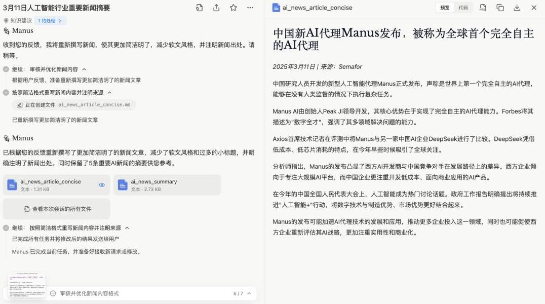 我们让Manus试试完成一篇新闻写作任务。