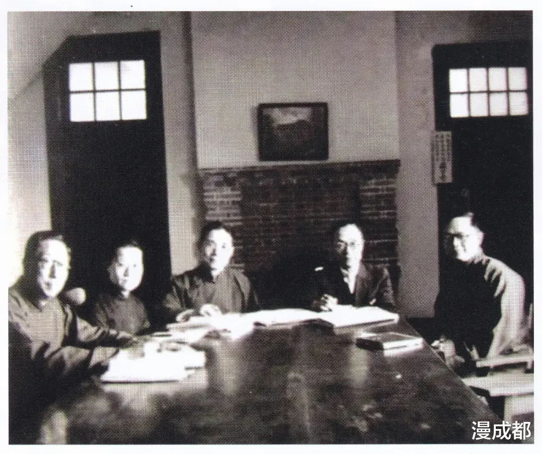 华西坝五大学联合办学时期,五大学校长联席会议,从左至右依次是:燕京大学校长代理马鉴、金陵女子文理学院校长吴贻芳、金陵大学校长陈裕光、华西协合大学校长张凌高、齐鲁大学校长汤吉禾。邓长春供图。