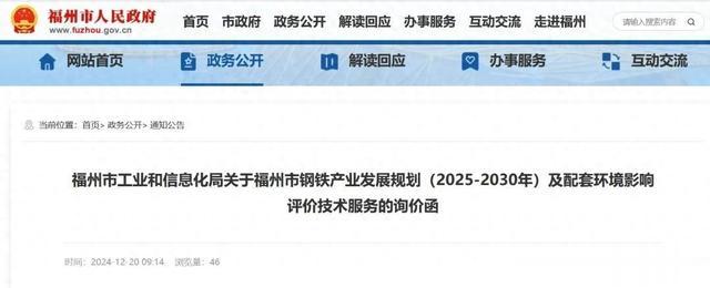 2024年12月20日,福州市人民政府发布《福州市工业和信息化局关于福州市钢铁产业发展规划(2025-2030年)及配套环境影响评价技术服务的询价函》,其中提及500万吨冷轧生产线内容。具体情况如下: