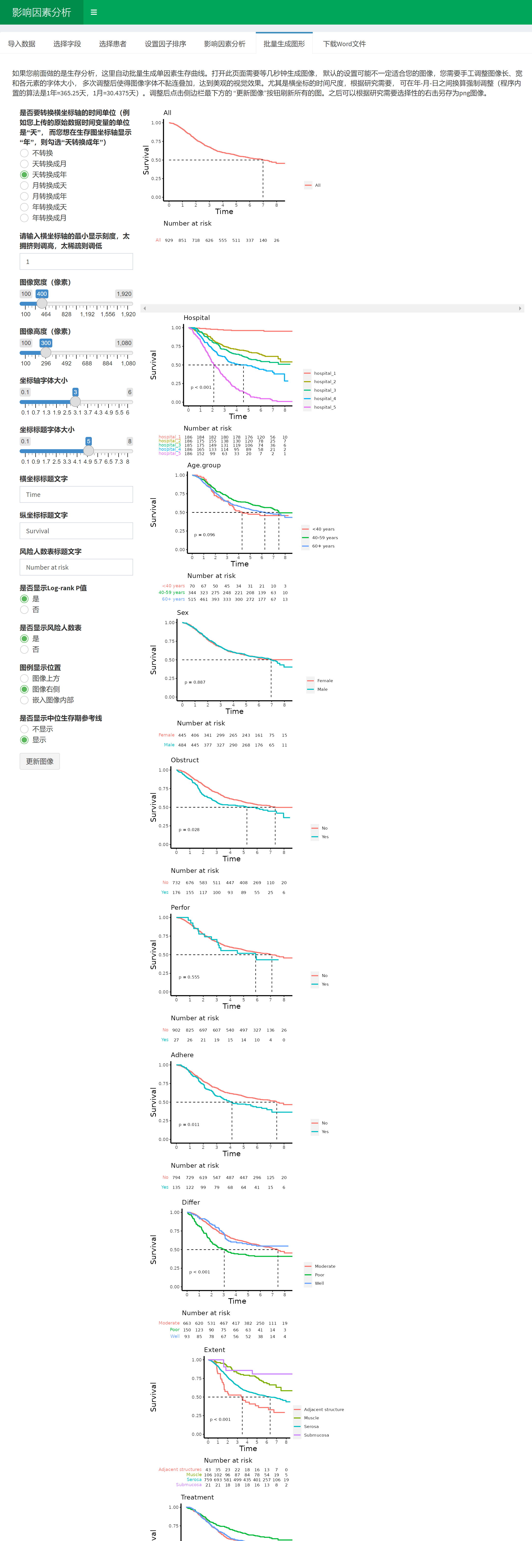 另外,在1.1版本中,如果您选择的是生存结局,用的Cox回归,也可以顺便批量生成生存曲线,当影响因素分析完成后,点击”批量生成图形”,就把所有变量分组的生存曲线瞬间生成了。