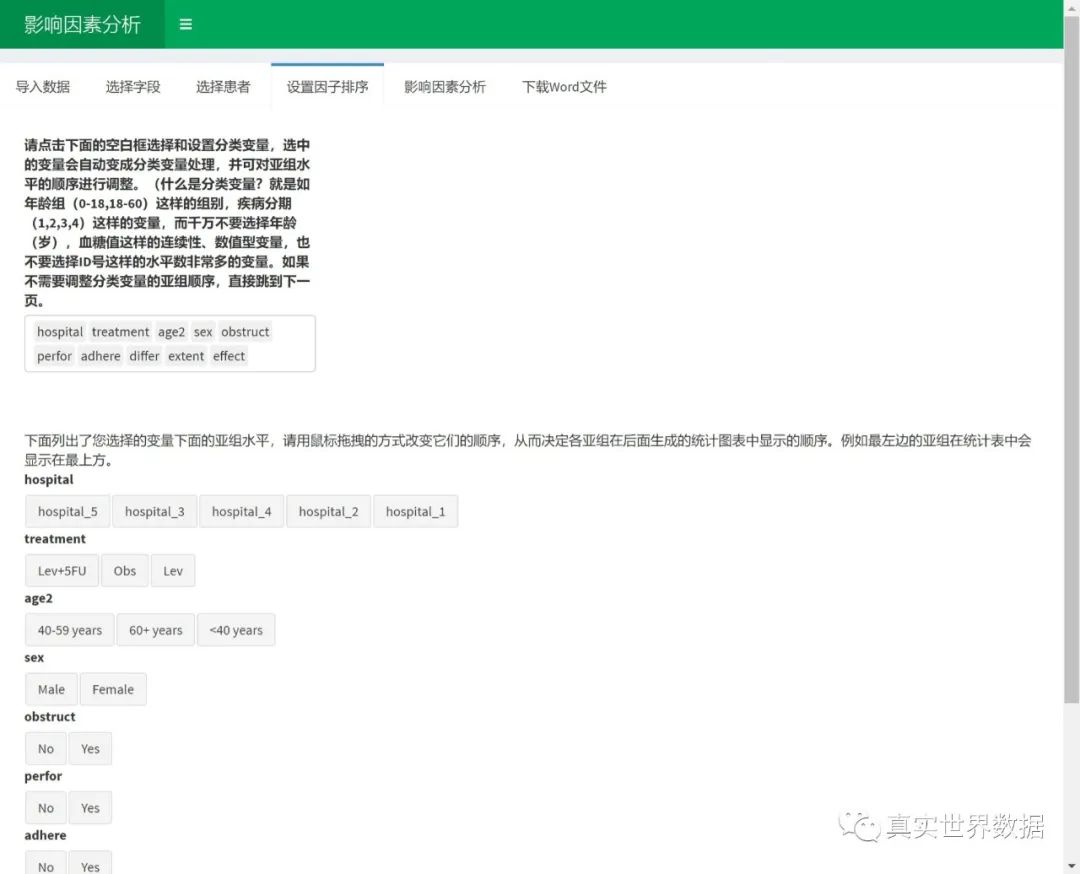 选择完毕之后,就可以用鼠标拖拽改变分类变量下面的亚组水平顺序啦!这个很关键,因为排在左边第一位的,在后面影响因素分析里是会作为参照水平的!