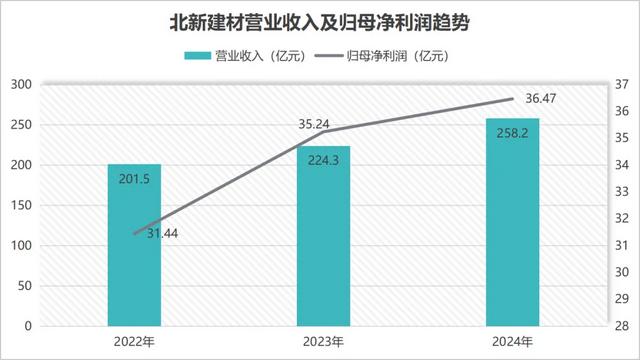 北新建材在 2024 年的营业收入达到258.2亿元,同比增长 15.14%,延续了近几年一直保持的增长趋势,且创了公司的历史新高。当然了,需要指出的的是,北新建材的营收增速是逐季回落,到了第四季度公司的单季营收为 54.58 亿元,同比仅仅增长了 1.5%,反映出行业需求端的边际走弱的态势。