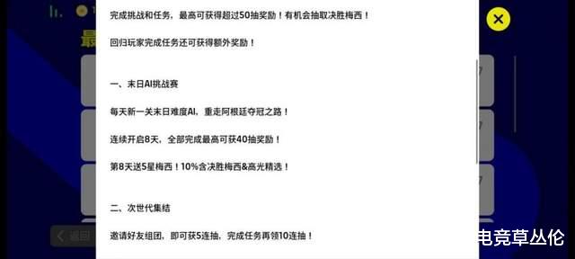 这次的末日AI挑战赛,《实况足球》手游的更新绝对是非常用心的。游戏将在每天为玩家带来一关末日难度的AI挑战,完成挑战的过程,完美还原了阿根廷夺冠的精彩历程,每一次完成挑战,玩家都可以获得惊喜奖励,完成所有挑战的玩家,将获得40连抽的机会,而在完成次时代组队任务后,玩家还能再次获得免费的10连抽,有机会直接获得决胜高光梅西和阿根廷队的精选球员!对于喜欢阿根廷队和梅西的球迷来说,这绝对是一次补强球队阵容的好机会。