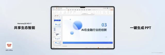 应用生态层面,HarmonyOS NEXT也为平板办公、创作生态带来了革新,为全新HUAWEI MatePad Pro 13.2 英寸带来了多款鸿蒙原生办公软件。用户在平板上可直接运行WPS Office 鸿蒙版、海泰浏览器 鸿蒙版、亿图脑图MindMaster 鸿蒙版、亿图图示 鸿蒙版以及中望 CAD鸿蒙版等桌面级办公应用。以WPS Office 鸿蒙版为例,当个人账户拥有相应权益时,可实现AI生成PPT等能力,为用户提供更智能更高效的办公体验。全新亿图脑图MindMaster鸿蒙版同样1:1还原了桌面级体验,将带来全量绘图功能和强大的AI能力,用户只需输入关键词,便可生成一份完整的思维导图。中望CAD鸿蒙版拥有与桌面端一致的功能面板,在平板终端即可实现流畅看图、多端协同,更可通过键鼠操作完成各类复杂的工业设计工作。