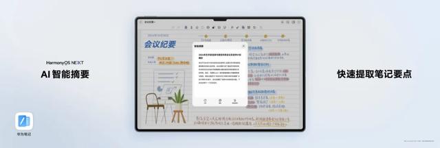 而另一款华为自研的专业笔记软件——华为笔记App则为新品带来了全新AI笔记摘要功能,能够基于文本与手写内容,快速提炼笔记要点,方便回顾。此外,得益于HarmonyOS NEXT的系统能力,华为笔记还支持跨端协作,用户通过其他设备拍摄或扫描文档后,华为笔记可直接调用拍摄内容进行编辑调整,记录过程简单高效。