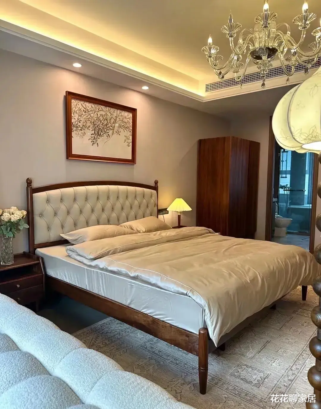 卧室空间洋溢着温馨与质感,整体风格融合了典雅与舒适,巧妙地将现代元素与经典韵味相结合。床头背景墙的装饰恰到好处,上方悬挂着一幅树枝图案的装饰画,简约而不失大方,与房间的色调完美融合,进一步营造出宁静祥和的氛围。