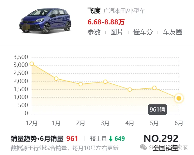 近日车卖家查了一下广汽本田飞度6月份的销量数据,第三方平台显示广汽本田飞度6月份卖了900多辆,连1000多辆都不到,而作为同级别的竞争对手,比亚迪海鸥6月份卖了35000多辆,比亚迪海豚卖了8400多辆,这么一对比广汽本田飞度的销量对比竞品真的是差距很大了!