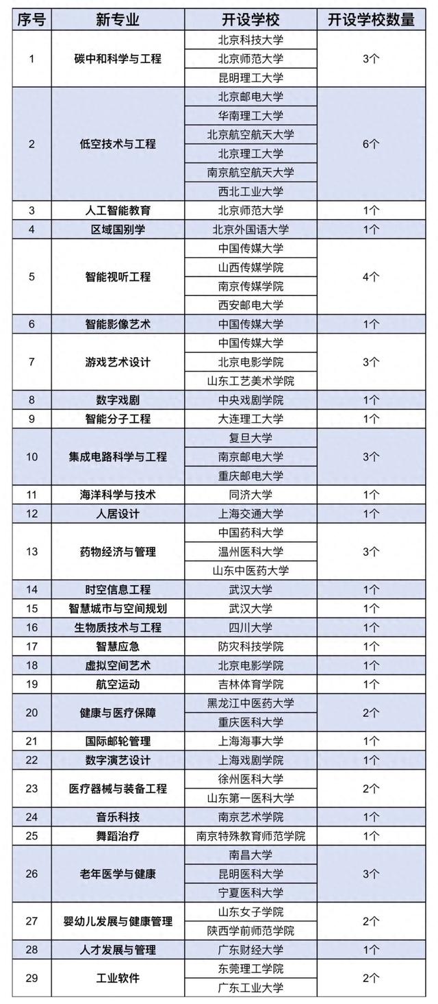 此次增设的29种新专业,充分体现国家战略、市场需求和科技发展牵引,在服务国家战略方面,增设了区域国别学、碳中和科学与工程、海洋科学与技术、健康与医疗保障等专业,面向科技发展前沿,增设了智能分子工程、医疗器械与装备工程、时空信息工程等专业,主动适应市场需求,增设了国际邮轮管理、航空运动、药物经济与管理等专业。同时,聚焦人工智能赋能经济社会发展,增设人工智能教育、智能视听工程、数字戏剧等专业。