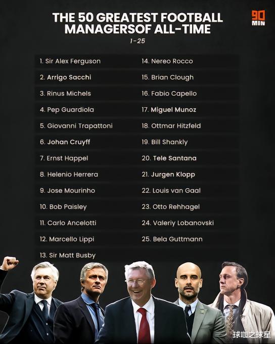 外媒90min媒体平台不久前评选出有史以来最伟大的50大足球主帅,前十名如下