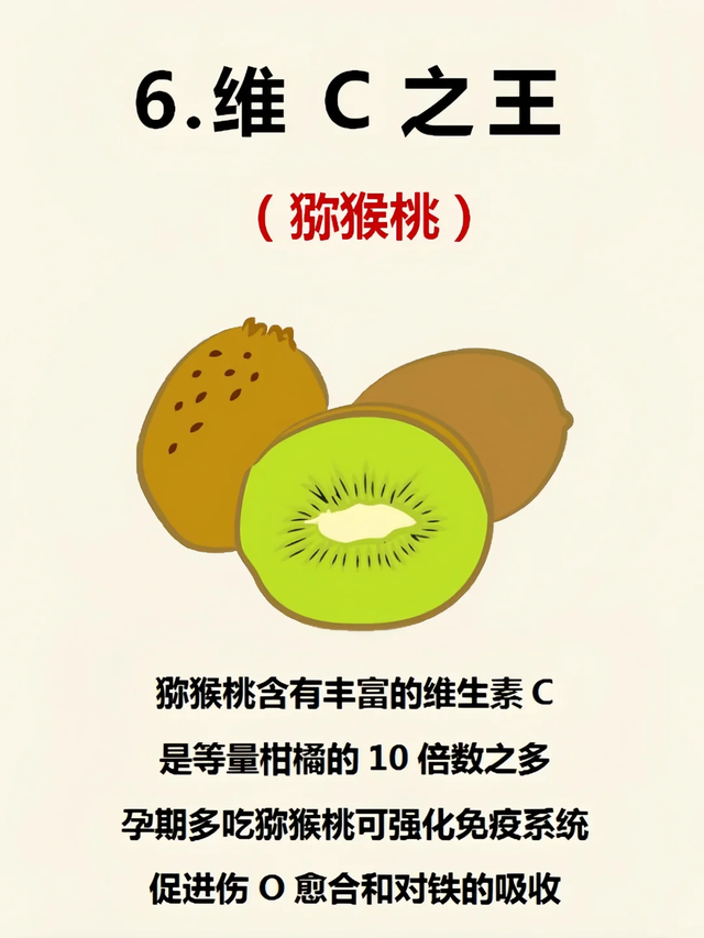 6. 猕猴桃——维C之王猕猴桃不仅味道鲜美,而且营养价值极高。每100克猕猴桃中就含有约92毫克的维生素C,几乎是成人每日所需量的一半以上。维生素C对于胶原蛋白合成至关重要,有助于维持皮肤弹性、促进伤口愈合。另外,猕猴桃中还含有丰富的维生素E、钾以及其他微量元素,可以全面补充孕期所需营养。
