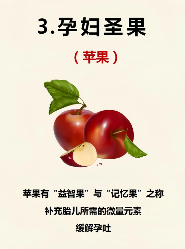 3. 苹果——孕妇圣果“一日一苹果,医生远离我”,这句话同样适用于孕妇群体。苹果不仅口感清脆甜美,而且营养价值丰富。它含有大量的膳食纤维可以帮助消化;丰富的维生素C和E则能有效抵御自由基侵害;更重要的是,苹果中的天然植物化学物质被认为能够降低新生儿哮喘风险。因此,将苹果纳入每日食谱是非常明智的选择。
