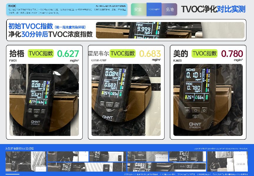 在1m³密闭实验舱内,通过TVOC装置释放污染物至浓度达9.9mg/m³(超国标安全值16倍)。随后将空气净化器放置舱内,开启最大档位运行,使用国标认证检测仪在机器30cm处实时监测。30分钟后对比TVOC残留浓度,下降幅度越大,净化效果越显著。
