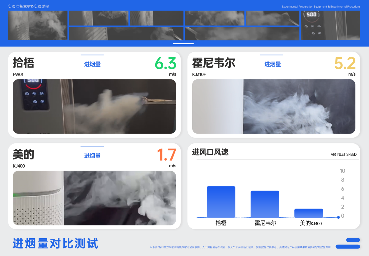 实验在密闭环境中进行,点燃标准烟饼释放高浓度烟雾后,将三台净化器(拾梧壁挂式/霍尼韦尔落地式/美的落地式)调至最大档位。通过风速仪测量峰值风速,并用高清摄像机多维度记录烟雾扩散轨迹及设备吸附效率,对比不同机型的实际表现。