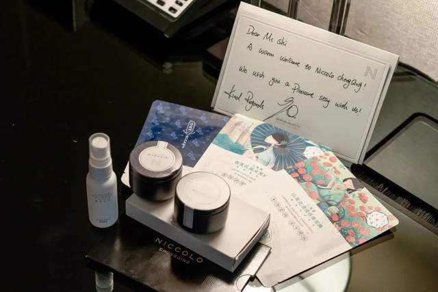 回房时夜床已开好,开床礼是Lorenzo Villoresi特别定制的旅行套装,内含洁面乳、眼部啫喱、润唇膏和晚霜各一支/8ml、枕头喷雾。酒店有7种不重复开床礼——除了Lorenzo Villoresi特定旅套,还有特色重庆火锅底料、沱茶、面膜、明信片,甚至蒸汽眼罩等,至于碰到什么就看运气了。