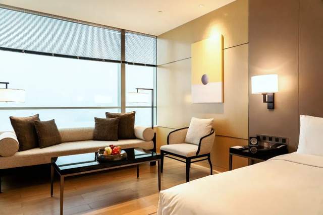 宽大的卫浴空间迎合追求舒适享受的旅客住宿要求,房间卧室和淋浴间都有整面落地窗,窗外是无限延伸的白云蓝天,江面城中的景致一览无遗。