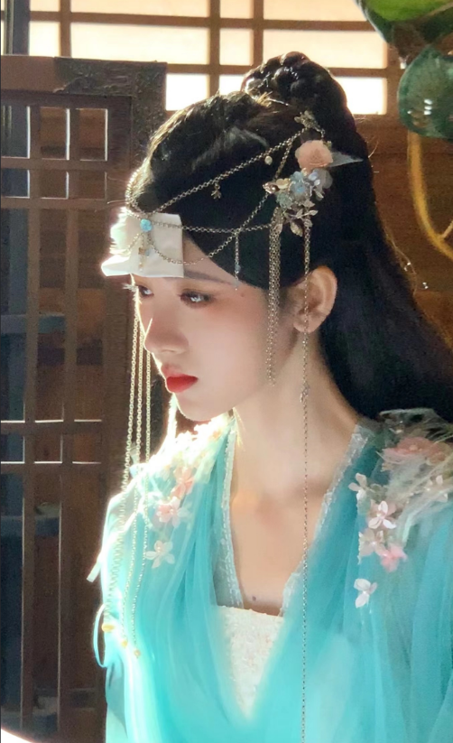 第二张是蓝色的造型!“你说过不伤我的!”“你骗我!”仙女落泪了,划过脸庞的这滴泪,隔着屏幕也感到好伤感,眼泪汪汪,令人心生怜爱。蓝色的花朵纱裙搭配白色抹胸,门帘头饰的脑门中心也是蓝色珍珠映衬,长发披肩,眼神变得坚定,她是女将军了。