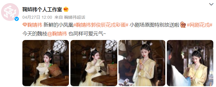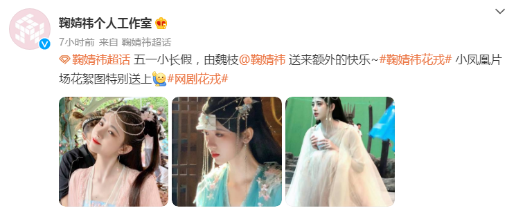 5月1日,鞠婧祎个人工作室分享了三宫格的戏服照,并发文写道:五一小长假,由魏枝(鞠婧祎)送来额外的快乐,鞠婧祎《花戎》小凤凰片场花絮图特别送上。网友:红橙黄绿青蓝紫,她在里面自己一个人演了七仙女吗?衣服怎么都这么好看。