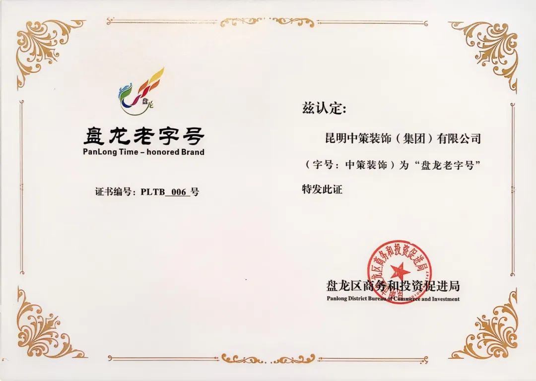 2025年3月14日,昆明市盘龙区商务和投资促进局正式授牌中策装饰成为第一批“盘龙老字号”,与昆明饭店、金格百货、健之佳等12家标杆企业共同书写盘龙商业文化新篇章!