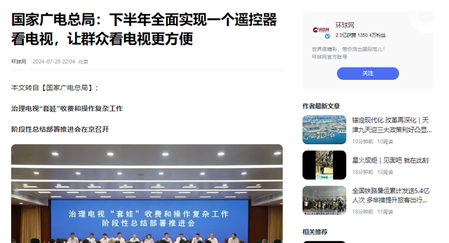 环球网:国家广电总局:下半年全面实现一个遥控器看电视,让群众看电视更方便
