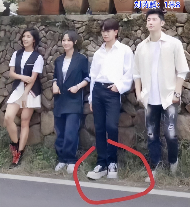 在一张照片中,他身边站着的是官方身高为1米80的刘芮麟,然而即便穿着厚底鞋,他也比刘芮麟矮了半个头。