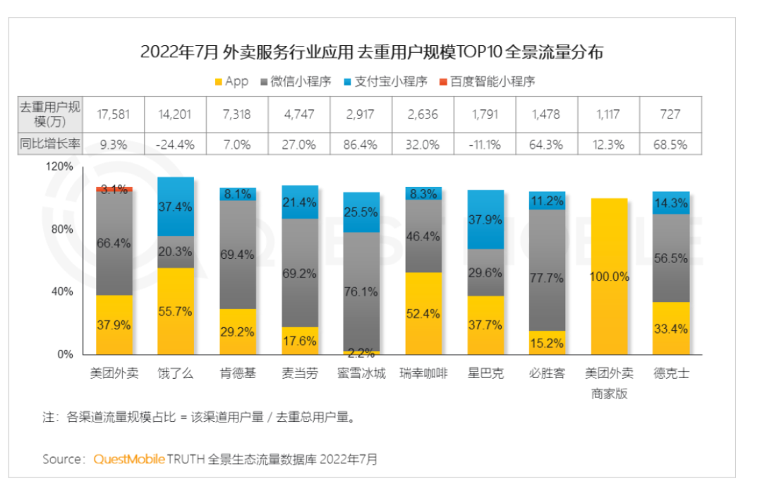 外卖业务就更依赖于超级APP了,且是外部超级APP。Questmobile数据显示,2022年7月,美团外卖中有66.4%来自于微信小程序。