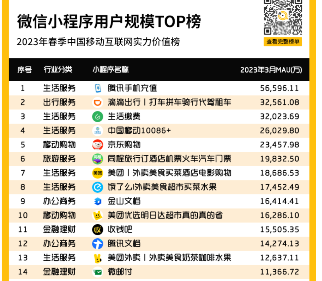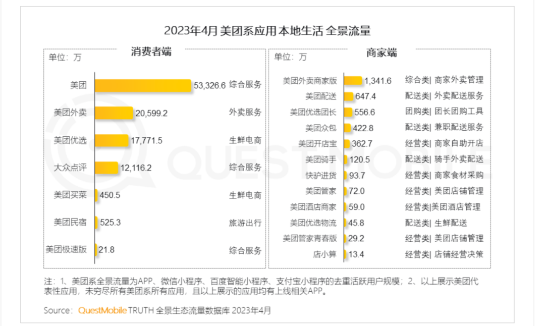 Questmobile报告显示,2023年,美团拥有三个月活过亿的微信小程序,包括美团、美团优选、美团外卖。