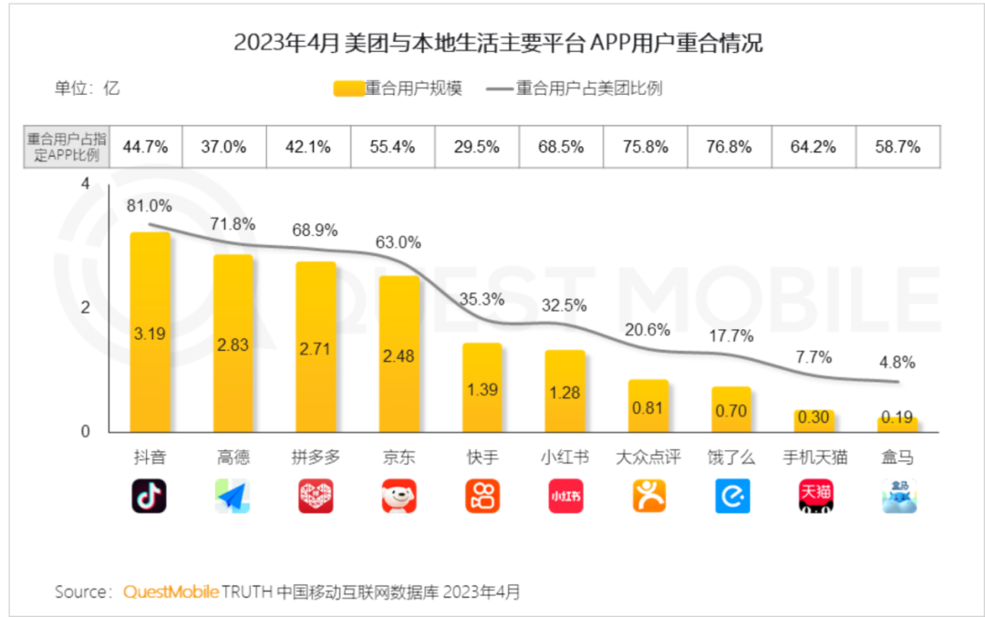另一方面,多个APP并行、且这些APP存在功能重叠,会造成一定程度的资源浪费。QuestMobile数据显示,今年4月大众点评与美团的用户高度重合,月活用户重合度高达75.8%。