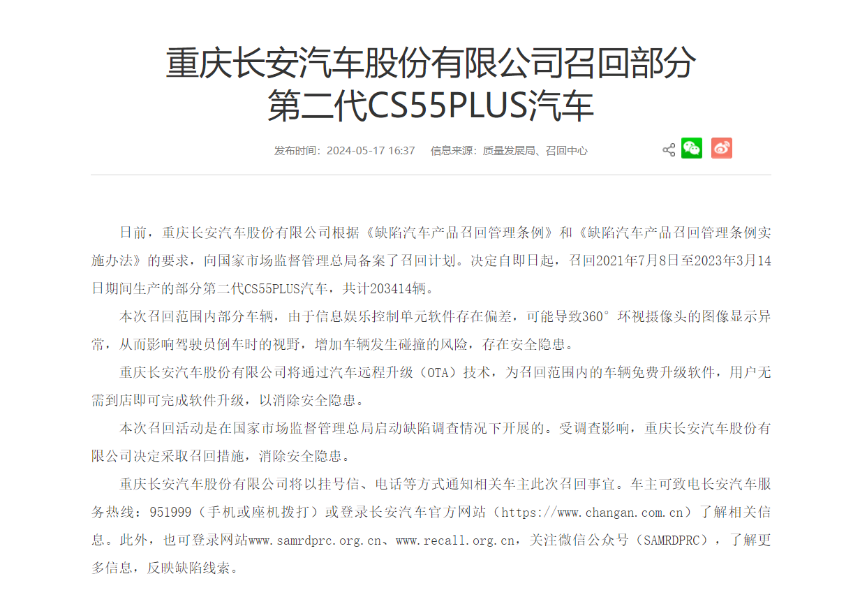 国家市场监督管理总局官网消息显示,2024年5月份,长安汽车共计召回了203414台车型。