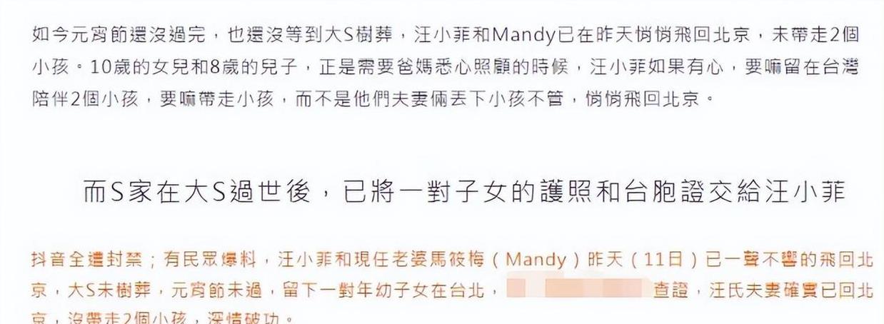 汪小菲疑似获授护照所以得等S家松口,主动来争孩子的抚养权。但现在有媒体爆出新料。据说现在S家把两个孩子的护照都给了汪小菲。不过这消息目前还没得到证实。