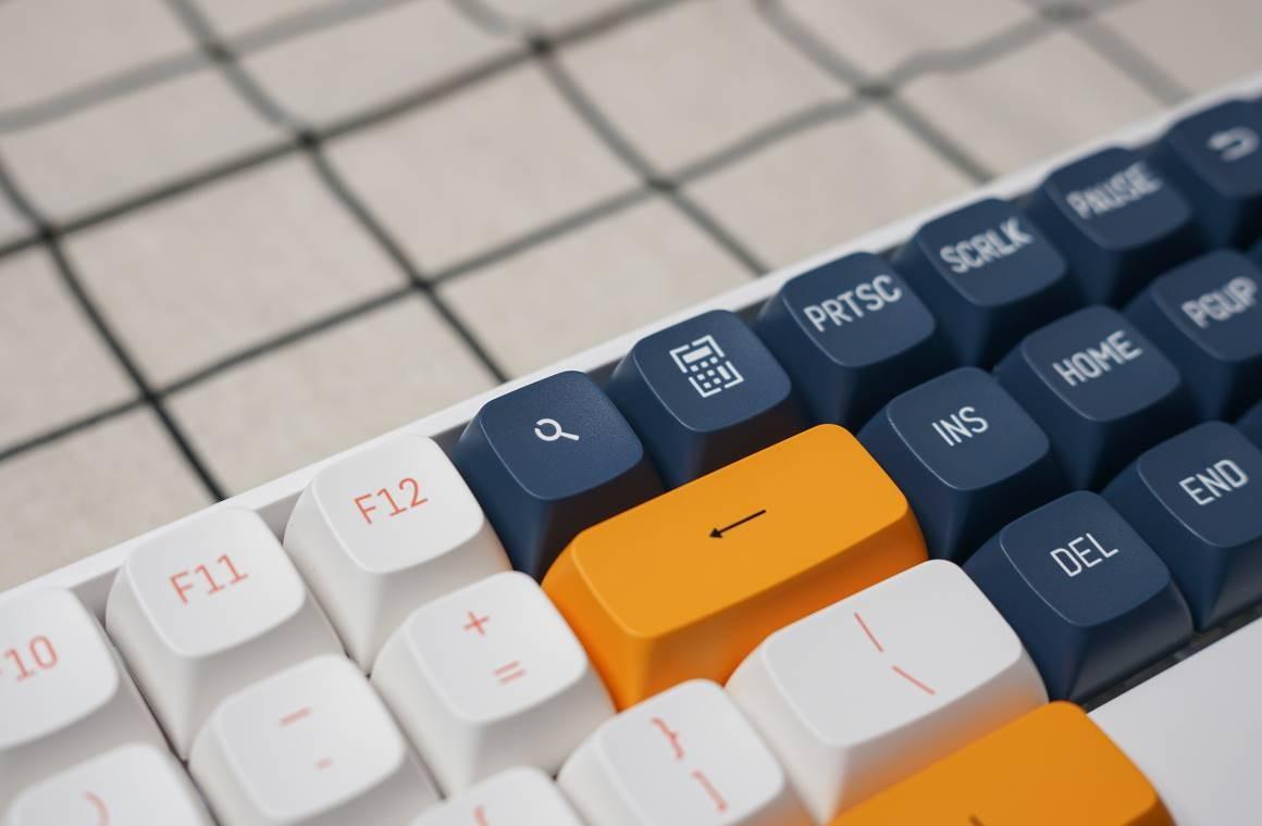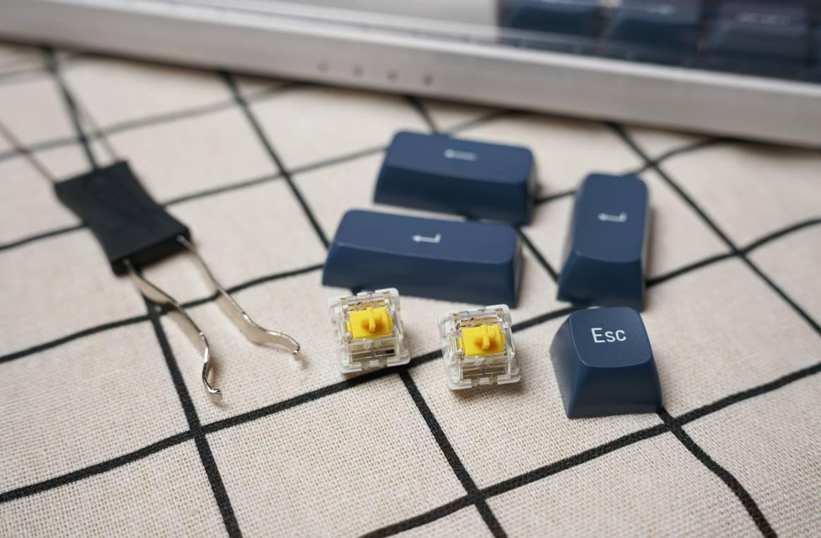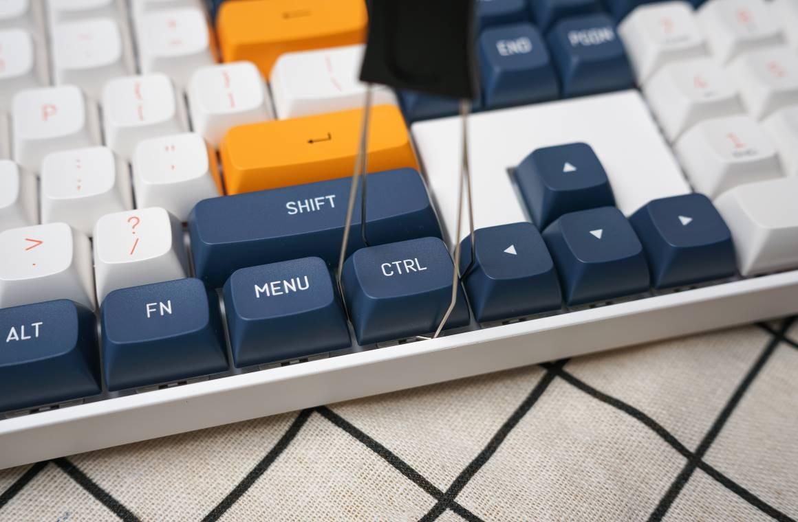 仔细观察的话,我们可以看到四个增补键帽对应的就是键盘上黄色的四个按键,把它换上去之后键盘就会变回纯粹的蓝白配色,这个可以根据个人喜欢自行选择。
