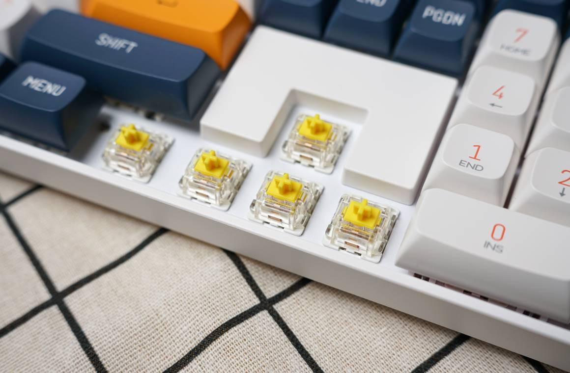 拔掉键帽之后可以看到轴体,这次我选择的黄轴是标准的线性轴手感,品牌为九紫电子,它的敲击寿命是5000万次,按压力度是45gf,属于办公和游戏都能兼顾的轴体。如果想要机械手感更强烈,打字体验更爽快的话,另外一个青轴版本也是不错的选择,不过使用的时候需要注意环境,避免打扰到其他人。
