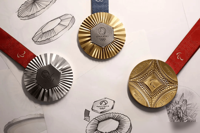 法国这次将埃菲尔铁塔的材料镶嵌进奖牌当中,象征着每位获奖运动员的“巴黎情怀”,一方面, 在镶嵌的金色上,呈现出一种独特的华丽感;另一方面,埃菲尔铁塔的镶嵌,也让每一块奖牌,都仿佛承载着一段巴黎的故事,成为一种独特的符号与象征。