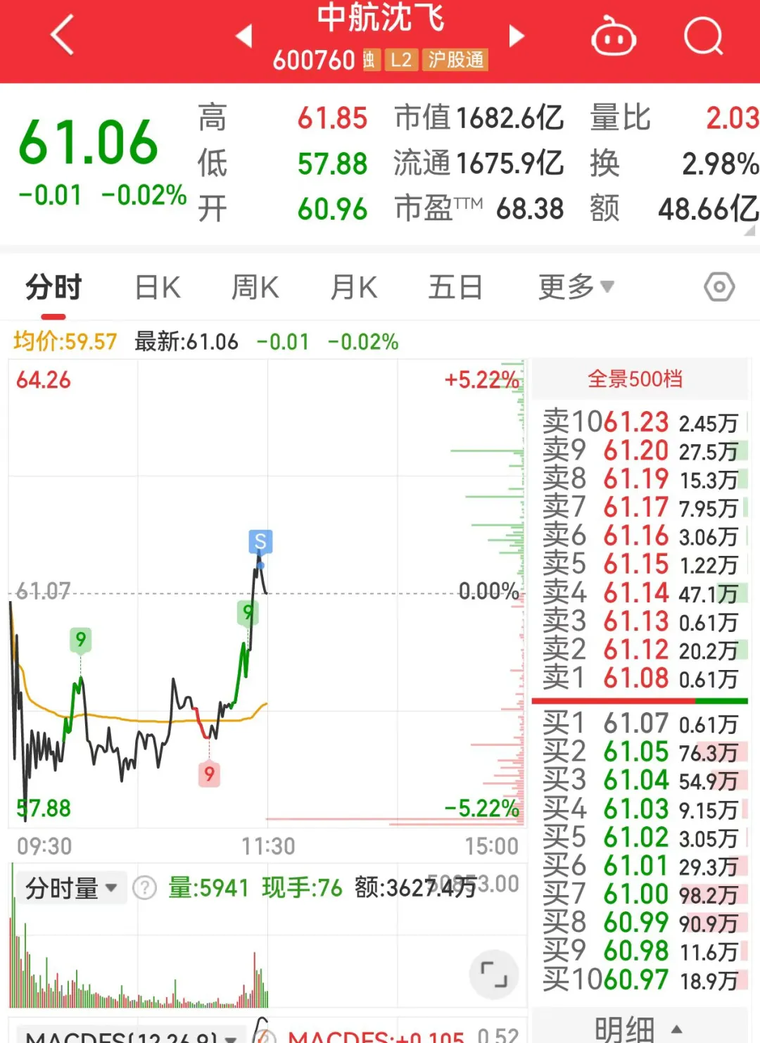 6、中航沈飞,早上受中国软件和中国长城的拖累,走的偏弱,临近中午冲高到红盘减了一笔,下午如果有冲高,应该会继续出,后面等分歧再看要不要接回来。