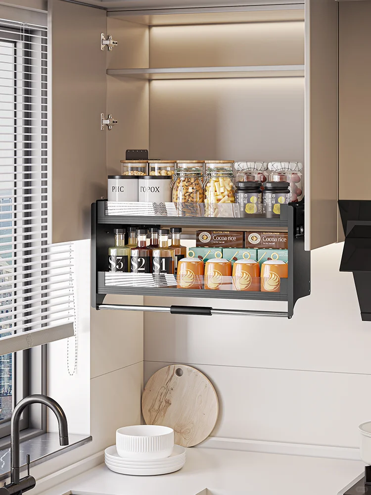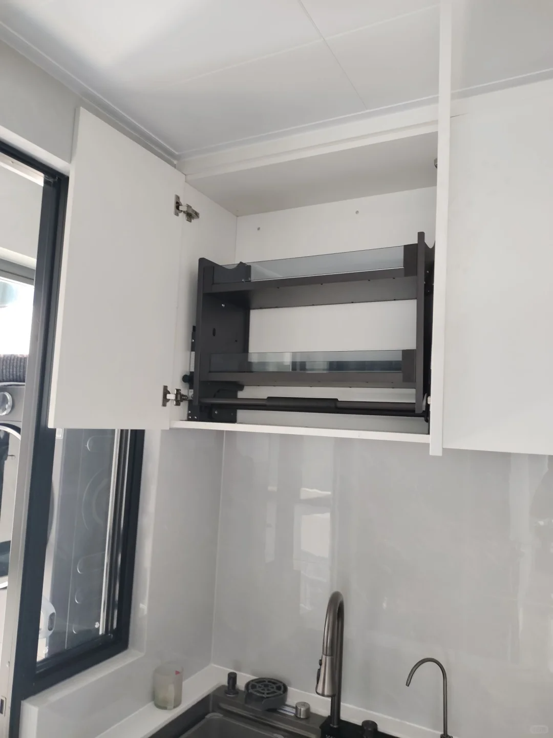但是吊柜拿取物品不便,所以很多人在这个基础上又做了升级的拉篮设计。