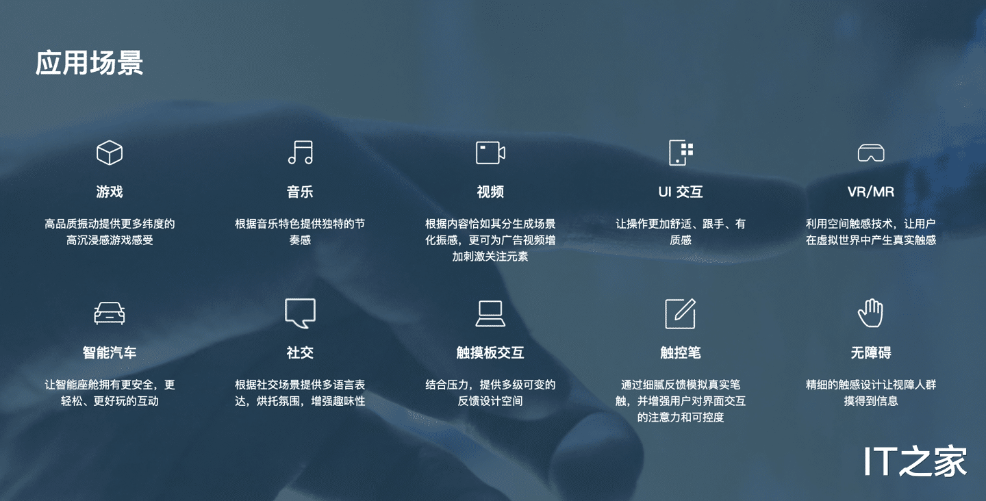 瑞声科技 RichTap® 凭借在触感反馈技术方面的深厚积累,与众多主流终端厂商及内容商合作,应用于丰富的移动应用场景中,如手机中各类游戏、社交、影音、输入法等,为手机用户打造出高品质触感体验;同时其还支持其他移动设备,如可穿戴设备、VR、游戏手柄、智能汽车等。其中,在移动游戏领域,瑞声科技 RichTap® 便与腾讯一同推进 IEEE 2861.3 标准落地。未来,瑞声科技 RichTap® 将持续与业内领先公司合作,拓展更多应用场景,并通过该标准和新技术共促触觉反馈生态发展,全面提升终端用户的触觉反馈体验。