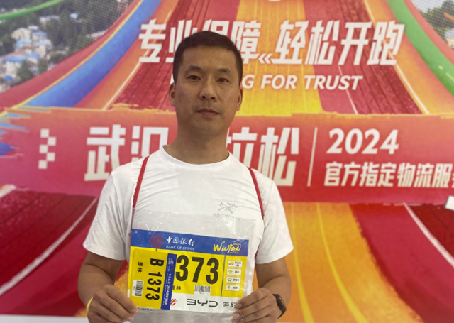 3月24日,2024武汉马拉松鸣枪开跑。山东人姜林特地从新疆温泉县赶来参加武汉马拉松的全马比赛。