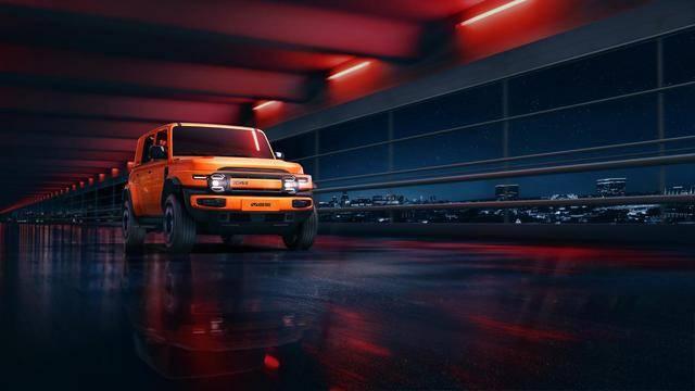 V23不仅在设计上致敬经典,更融合当下新能源设计的趋势,打造出独一无二的视觉体验。V23造型方正硬朗,车身尺寸长4220mm、宽1915mm、高1845mm,接近1:1的高宽比,配合21吋大轮毂,赋予整车超越同级的体量感和视觉冲击力。圆形大灯、固定式侧踏板、C柱盲窗等经典越野元素,与现代科技外露式四角透明毫米波雷达罩、立体悬浮式“小书包”、乐高模块刹车尾灯等设计相结合,使V23既“复古经典”又“科技赛博”。
