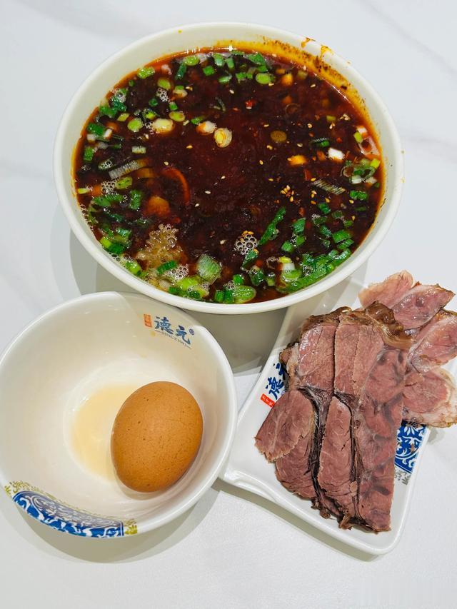 德元的辣椒是辣味和辣香并存,不像我们常见的兰州牛肉面辣椒只香不辣,虽然辣度比不上重庆辣,但也是兰州当地人喜欢的辣度。8元1碗的兰州牛肉面一般只有少许碎牛肉,额外加入牛肉和卤蛋,这叫做“肉蛋双飞”,一口牛肉一口面,再来一口卤鸡蛋,胃口被完全打开,如果感到辣了,喝杯自助的茶水,清爽解腻。