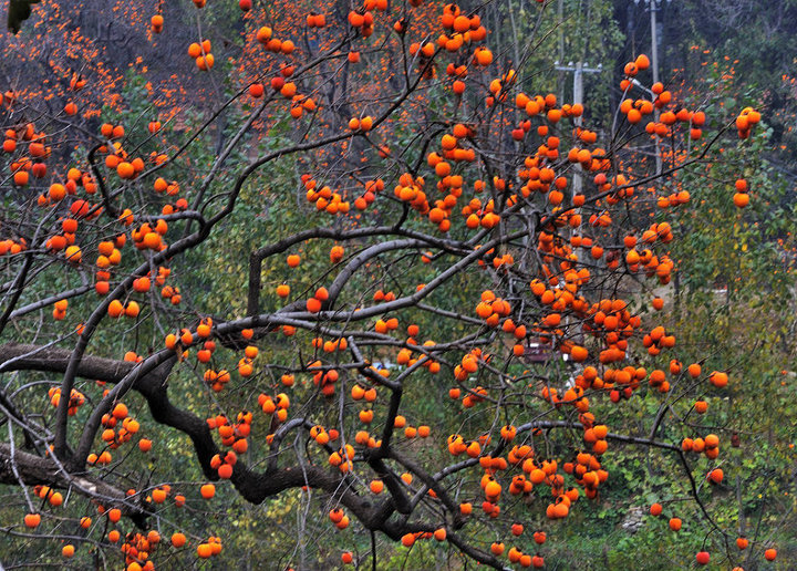 寒露时节,漫步在农村山上,空气的清香、柿子的甘饴扑鼻而来。近期正是柿子成熟的时候,一个个柿子像盏盏红色的小灯笼缀满枝丫,清寂的小山村顿时变得绚丽多彩。随着冬天的悄然来近,树叶脱离了枝条,重新回归大自然的怀抱。只留下红彤彤的柿子,挂在颤悠悠的枝头,煞是惹人欢喜。在村前的小山坡上,村民拿着一根长长的杆子采摘柿子,一拉就是一个,不一会功夫,满满两袋柿子就摘好了。由于新鲜的柿子不易保存,所以收获的柿子除供生食外,还用传统的方法进行深加工,做成柿饼等。趁着连日来的晴好天气,果农们忙着将新收获的柿子进行筛选、脱皮、串线、挂晾,加工成柿饼准备走出深山,销往各地。一年一度,各家各户做柿饼也甚是壮观,各家平台都摆满了柿子。