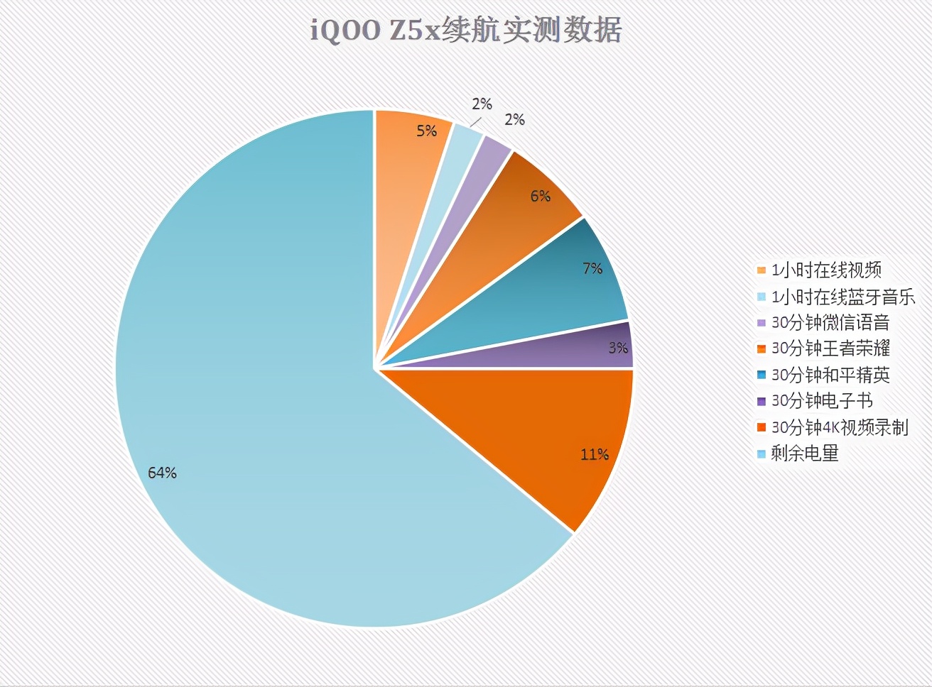 为了检验这块大电池的电量是否足够持久,我针对日常生活中常见的几类使用场景,对iQOO Z5x进行了一轮重度测试。测试结果如下:一小时在线视频,iQOO Z5x耗电5%;一小时蓝牙音乐,耗电2%;30分钟微信语音、30分钟电子书分别耗电2%、3%。