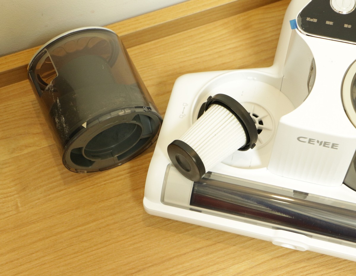 希亦RM1采用的是真双杯尘气分离设计,一个0.2升的过滤尘杯和一个0.4升的集尘杯,一个杯子用于过滤灰尘,一个杯子用于储存尘螨。
