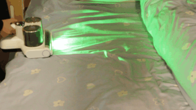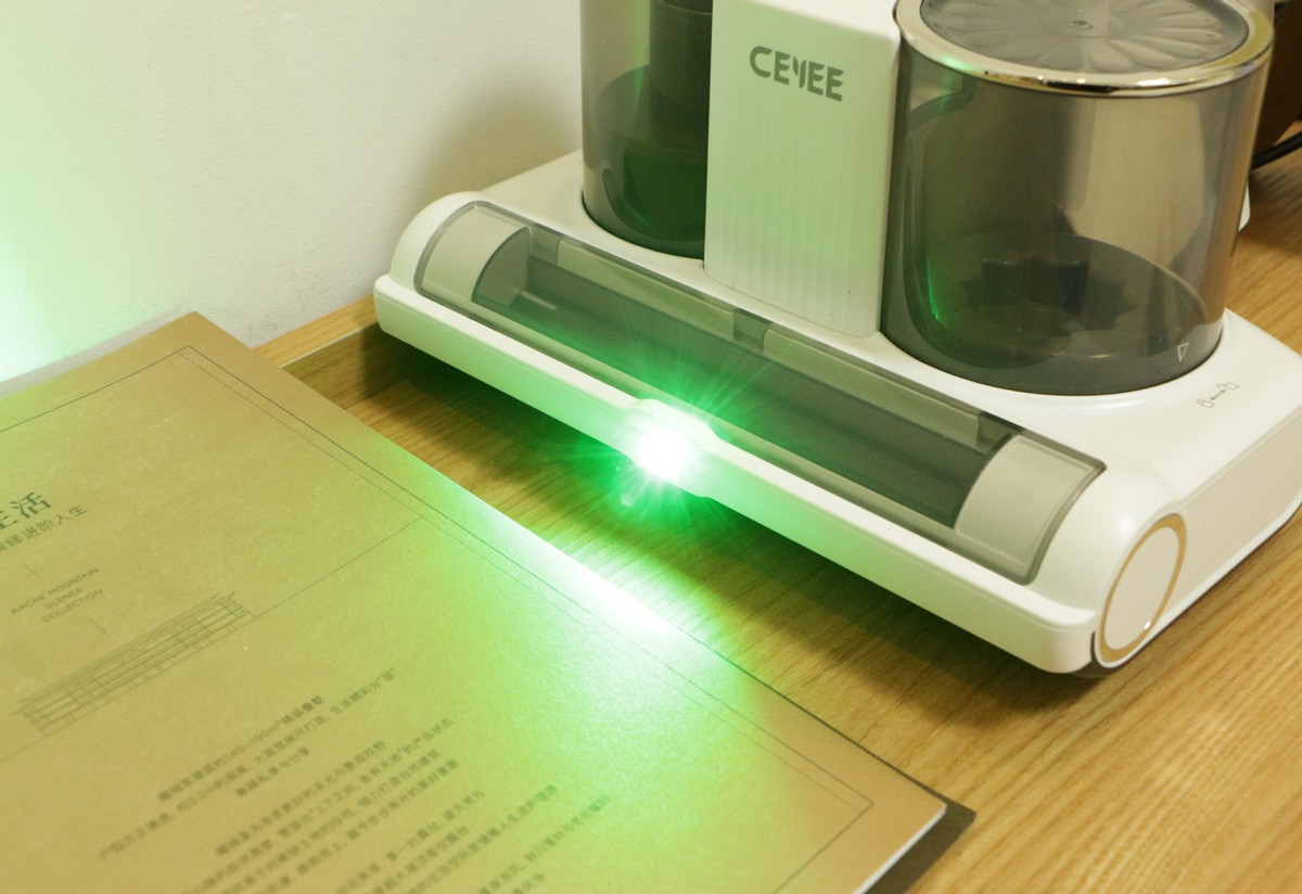 启动除螨仪后,可以看到前端的小灯散发出一束很强烈的绿色光。