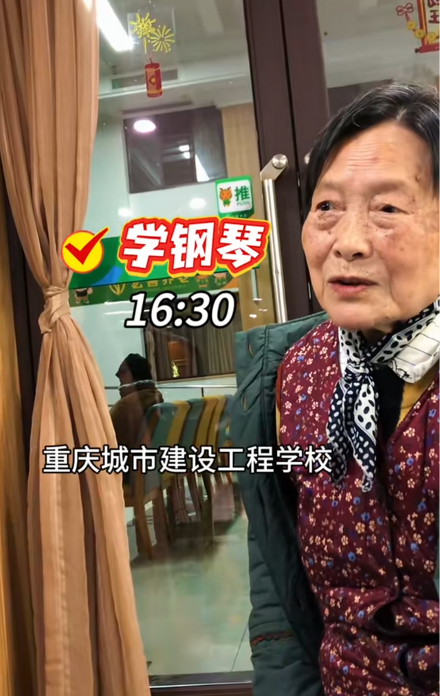 吃完饭后,小伙还偶遇了正在弹钢琴的老奶奶。