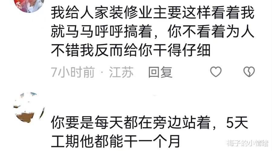 看到女业主分享的监工日常后,很多在工地干活的网友表示深有体会。因为在未完工的房子内装修,上厕所有时候是一个特别尴尬而隐蔽的事情,如今有了业主的监工,并且还是一个女业主,工人师傅肯定不敢上厕所了,这样忍着身体的不适去干活,施工效率自然是会受到影响。