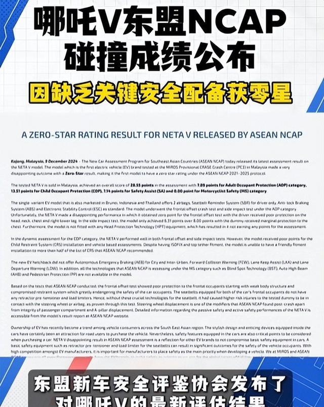 不少国产车企显得有点自信过头,觉得自己在国内市场上做得挺好,讲着自家车的优势,跑去国外市场也一样能轻松过关。结果一打碰撞测试,要么得个0星,要么表现惨不忍睹。这样一来,车企的声誉和市场份额,基本上直接被掀翻,再想翻身,难如登天。哪吒V在ASEANNCAP的碰撞测试中拿到0星,这一结果简直是离谱。大家都知道,在车市里,拿到一个好成绩是能为品牌加分的,但哪吒V的成绩直接让人傻眼。前碰撞、侧碰撞、头部保护这几个重要项目,全部得0分,这可不是开玩笑,简直像是见鬼了一样。