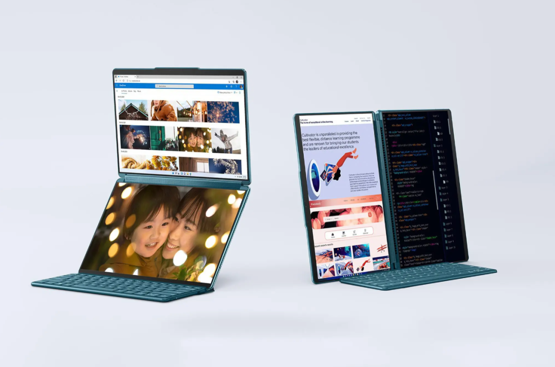联想推出了 Yoga Book,用第二个屏幕取代了传统笔记本电脑的键盘面板。它有两个 13.3 英寸 OLED 显示屏,铰接在中间,因此它可以像传统笔记本电脑一样放在桌子上使用,像帐篷一样支撑起来,像书本一样阅读,或者像平板电脑一样折叠起来。